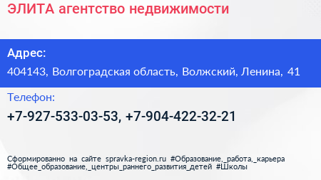 ЭЛИТА, агентство недвижимости по адресу 404143, Волгоградская область, Волжский, Ленина, 41 в дальнейшем Организация, размещена в следующих категориях: