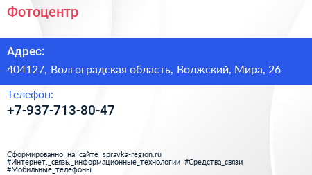 Фотоцентр по адресу 404127, Волгоградская область, Волжский, Мира, 26 в дальнейшем Организация, размещена в следующих категориях: