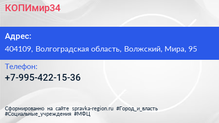 КОПИмир34 по адресу 404109, Волгоградская область, Волжский, Мира, 95 в дальнейшем Организация, размещена в следующих категориях: