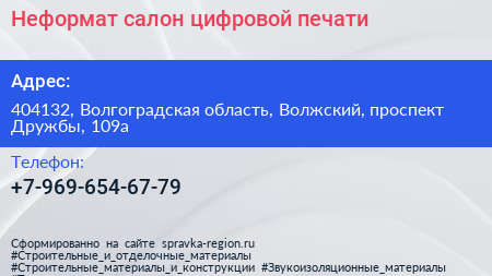 Неформат, салон цифровой печати по адресу 404132, Волгоградская область, Волжский, проспект Дружбы, 109а в дальнейшем Организация, размещена в следующих категориях: