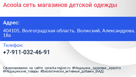 Acoola, сеть магазинов детской одежды по адресу 404105, Волгоградская область, Волжский, Александрова, 18а в дальнейшем Организация, размещена в следующих категориях: