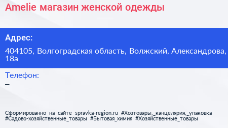 Amelie, магазин женской одежды по адресу 404105, Волгоградская область, Волжский, Александрова, 18а в дальнейшем Организация, размещена в следующих категориях:
