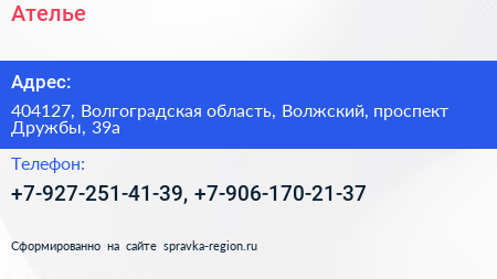 Ателье по адресу 404127, Волгоградская область, Волжский, проспект Дружбы, 39а в дальнейшем Организация, размещена в следующих категориях: