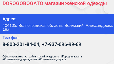 DOROGOBOGATO, магазин женской одежды по адресу 404105, Волгоградская область, Волжский, Александрова, 18а в дальнейшем Организация, размещена в следующих категориях: