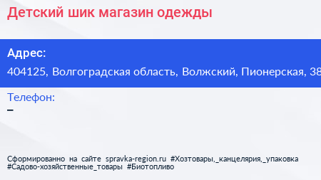 Детский шик, магазин одежды по адресу 404125, Волгоградская область, Волжский, Пионерская, 38 в дальнейшем Организация, размещена в следующих категориях: