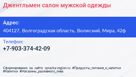 Джентльмен, салон мужской одежды по адресу 404127, Волгоградская область, Волжский, Мира, 42ф в дальнейшем Организация, размещена в следующих категориях: