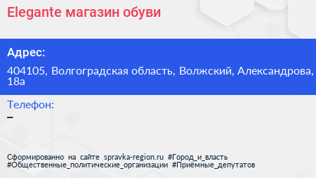 Elegante, магазин обуви по адресу 404105, Волгоградская область, Волжский, Александрова, 18а в дальнейшем Организация, размещена в следующих категориях:
