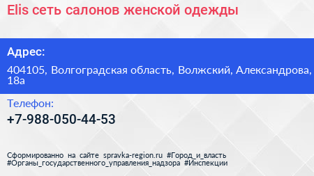 Elis, сеть салонов женской одежды по адресу 404105, Волгоградская область, Волжский, Александрова, 18а в дальнейшем Организация, размещена в следующих категориях: