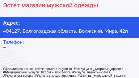 Эстет, магазин мужской одежды по адресу 404127, Волгоградская область, Волжский, Мира, 42п в дальнейшем Организация, размещена в следующих категориях: