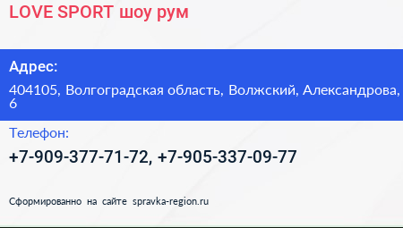 LOVE SPORT, шоу-рум по адресу 404105, Волгоградская область, Волжский, Александрова, 6 в дальнейшем Организация, размещена в следующих категориях: