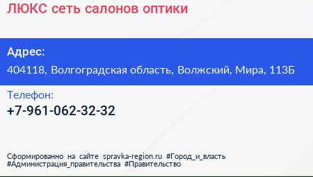 ЛЮКС, сеть салонов оптики по адресу 404118, Волгоградская область, Волжский, Мира, 113Б в дальнейшем Организация, размещена в следующих категориях: