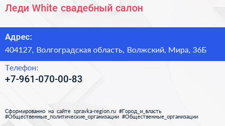 Леди White, свадебный салон по адресу 404127, Волгоградская область, Волжский, Мира, 36Б в дальнейшем Организация, размещена в следующих категориях: