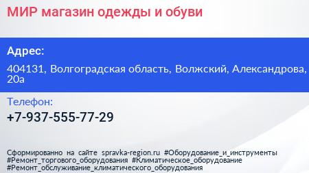МИР, магазин одежды и обуви по адресу 404131, Волгоградская область, Волжский, Александрова, 20а в дальнейшем Организация, размещена в следующих категориях: