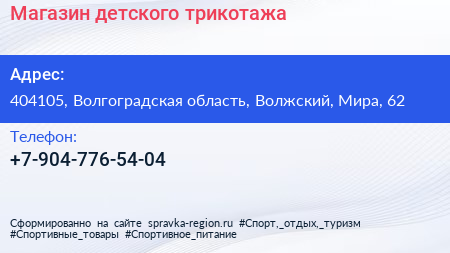 Магазин детского трикотажа по адресу 404105, Волгоградская область, Волжский, Мира, 62 в дальнейшем Организация, размещена в следующих категориях: