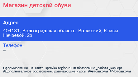 Магазин детской обуви по адресу 404131, Волгоградская область, Волжский, Клавы Нечаевой, 2а в дальнейшем Организация, размещена в следующих категориях: