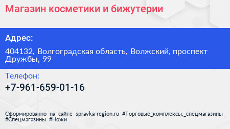 Магазин косметики и бижутерии по адресу 404132, Волгоградская область, Волжский, проспект Дружбы, 99 в дальнейшем Организация, размещена в следующих категориях: