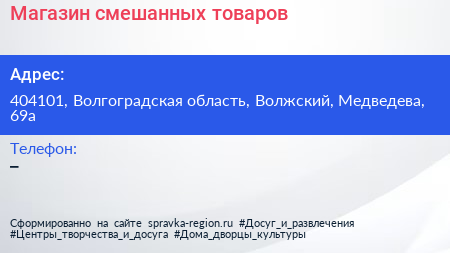 Магазин смешанных товаров по адресу 404101, Волгоградская область, Волжский, Медведева, 69а в дальнейшем Организация, размещена в следующих категориях: