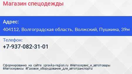 Магазин спецодежды по адресу 404112, Волгоградская область, Волжский, Пушкина, 39м в дальнейшем Организация, размещена в следующих категориях: