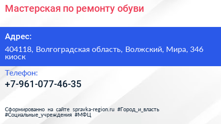 Мастерская по ремонту обуви по адресу 404118, Волгоградская область, Волжский, Мира, 346 киоск в дальнейшем Организация, размещена в следующих категориях: