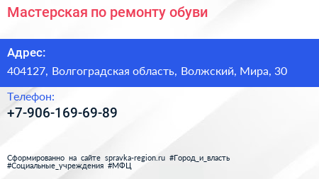 Мастерская по ремонту обуви по адресу 404127, Волгоградская область, Волжский, Мира, 30 в дальнейшем Организация, размещена в следующих категориях: