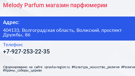 Melody Parfum, магазин парфюмерии по адресу 404133, Волгоградская область, Волжский, проспект Дружбы, 86 в дальнейшем Организация, размещена в следующих категориях: