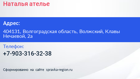 Наталья, ателье по адресу 404131, Волгоградская область, Волжский, Клавы Нечаевой, 2а в дальнейшем Организация, размещена в следующих категориях: