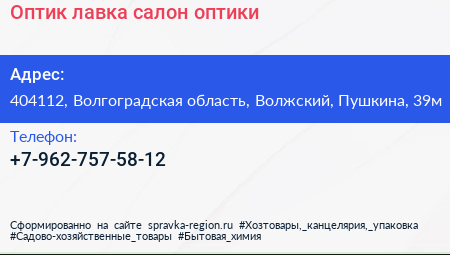 Оптик-лавка, салон оптики по адресу 404112, Волгоградская область, Волжский, Пушкина, 39м в дальнейшем Организация, размещена в следующих категориях: