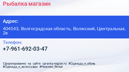 Рыбалка, магазин по адресу 404143, Волгоградская область, Волжский, Центральная, 2в в дальнейшем Организация, размещена в следующих категориях: