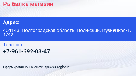 Рыбалка, магазин по адресу 404143, Волгоградская область, Волжский, Кузнецкая-1, 1/42 в дальнейшем Организация, размещена в следующих категориях: