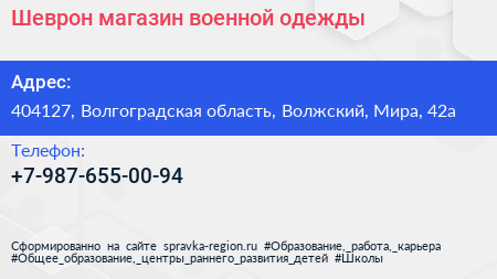 Шеврон, магазин военной одежды по адресу 404127, Волгоградская область, Волжский, Мира, 42а в дальнейшем Организация, размещена в следующих категориях: