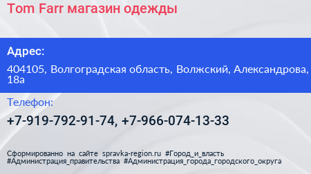 Tom Farr, магазин одежды по адресу 404105, Волгоградская область, Волжский, Александрова, 18а в дальнейшем Организация, размещена в следующих категориях: