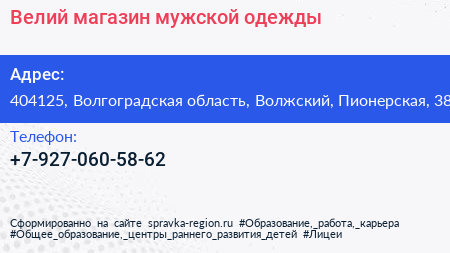 Велий, магазин мужской одежды по адресу 404125, Волгоградская область, Волжский, Пионерская, 38 в дальнейшем Организация, размещена в следующих категориях: