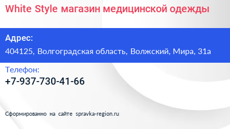 White Style, магазин медицинской одежды по адресу 404125, Волгоградская область, Волжский, Мира, 31а в дальнейшем Организация, размещена в следующих категориях: