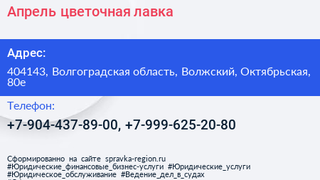 Апрель, цветочная лавка по адресу 404143, Волгоградская область, Волжский, Октябрьская, 80е в дальнейшем Организация, размещена в следующих категориях: