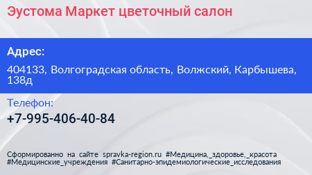 Эустома-Маркет, цветочный салон по адресу 404133, Волгоградская область, Волжский, Карбышева, 138д в дальнейшем Организация, размещена в следующих категориях: