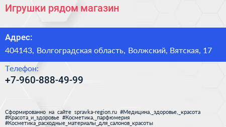 Игрушки рядом, магазин по адресу 404143, Волгоградская область, Волжский, Вятская, 17 в дальнейшем Организация, размещена в следующих категориях: