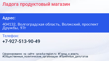 Ладога, продуктовый магазин по адресу 404132, Волгоградская область, Волжский, проспект Дружбы, 97г в дальнейшем Организация, размещена в следующих категориях: