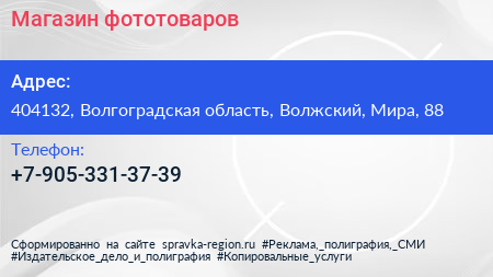 Магазин фототоваров по адресу 404132, Волгоградская область, Волжский, Мира, 88 в дальнейшем Организация, размещена в следующих категориях: