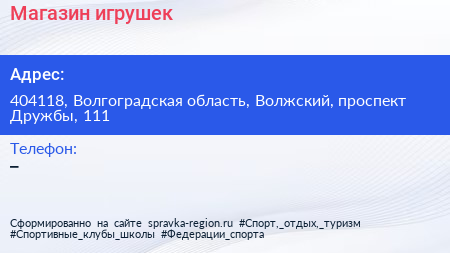 Магазин игрушек по адресу 404118, Волгоградская область, Волжский, проспект Дружбы, 111 в дальнейшем Организация, размещена в следующих категориях: