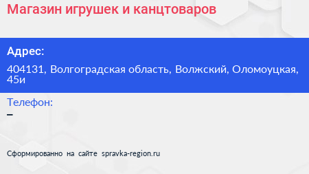 Магазин игрушек и канцтоваров по адресу 404131, Волгоградская область, Волжский, Оломоуцкая, 45и в дальнейшем Организация, размещена в следующих категориях: