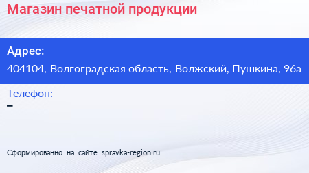 Магазин печатной продукции по адресу 404104, Волгоградская область, Волжский, Пушкина, 96а в дальнейшем Организация, размещена в следующих категориях: