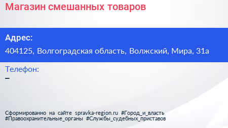 Магазин смешанных товаров по адресу 404125, Волгоградская область, Волжский, Мира, 31а в дальнейшем Организация, размещена в следующих категориях: