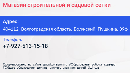 Магазин строительной и садовой сетки по адресу 404112, Волгоградская область, Волжский, Пушкина, 39ф в дальнейшем Организация, размещена в следующих категориях:
