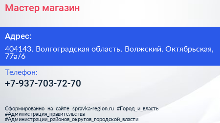 Мастер, магазин по адресу 404143, Волгоградская область, Волжский, Октябрьская, 77а/6 в дальнейшем Организация, размещена в следующих категориях: