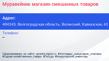 Муравейник, магазин смешанных товаров по адресу 404143, Волгоградская область, Волжский, Кавказская, 61 в дальнейшем Организация, размещена в следующих категориях: