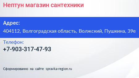 Нептун, магазин сантехники по адресу 404112, Волгоградская область, Волжский, Пушкина, 39е в дальнейшем Организация, размещена в следующих категориях: