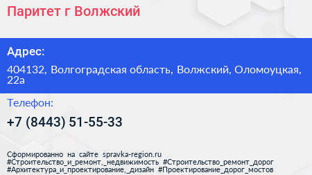 Паритет, г. Волжский по адресу 404132, Волгоградская область, Волжский, Оломоуцкая, 22а в дальнейшем Организация, размещена в следующих категориях: