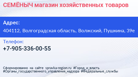СЕМЁНЫЧ, магазин хозяйственных товаров по адресу 404112, Волгоградская область, Волжский, Пушкина, 39е в дальнейшем Организация, размещена в следующих категориях: