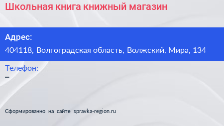 Школьная книга, книжный магазин по адресу 404118, Волгоградская область, Волжский, Мира, 134 в дальнейшем Организация, размещена в следующих категориях: