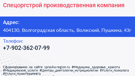 Спецоргстрой, производственная компания по адресу 404130, Волгоградская область, Волжский, Пушкина, 43г в дальнейшем Организация, размещена в следующих категориях: